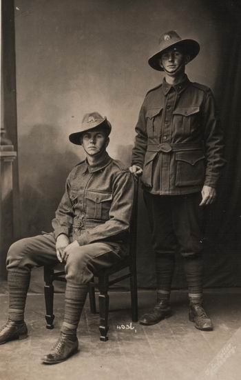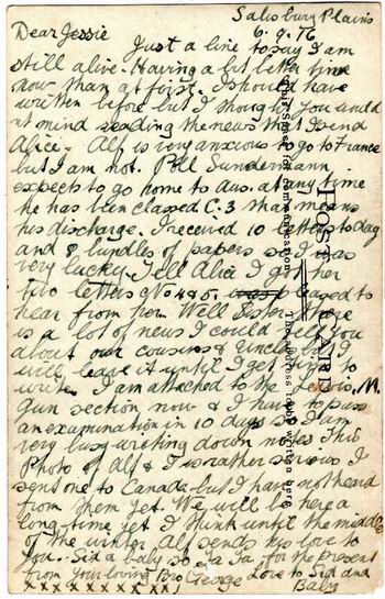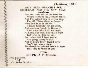 It is very hard to re-create the life a person whom no-one alive today has memories of. Alf was Esthers favorite brother. This photo card was taken in England before they went to France. There is a line to indicate that they had visited Cousins and Uncles (and Aunts I assume) in England. Alf was killed in 1918 6 weeks before the war ended. See the diggers page for more details. His brother George spoke very little about the war so much history has been lost. In May 2010 I came across a photo taken a week before he was killed, see below: |
