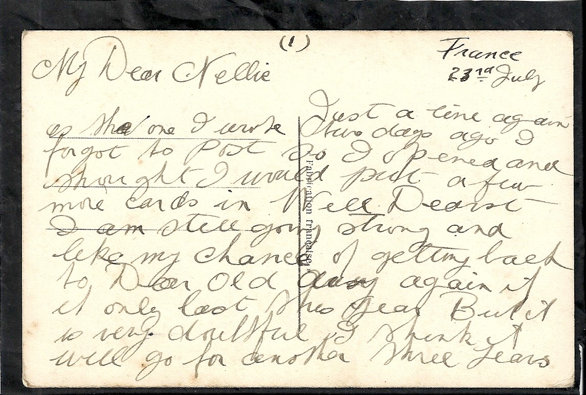 These letters are not full of information about the war as the censors had to read each one. The more interesting ones would have been the ones he received from Nellie but he burnt them after reading twice as he describes here. Nellie also burnt a lot of his letters in the backyard after he died. My mother described finding her out there crying as she threw them into the incinerator. Interestingly she left one for us to find and it is well worth a read. It was from his cousin Sadie in Canada. Link here.
