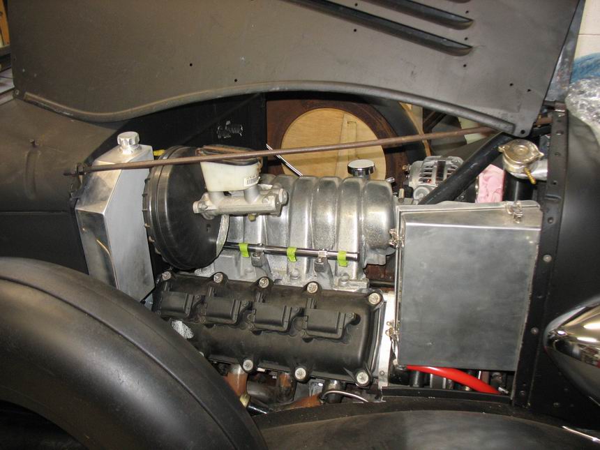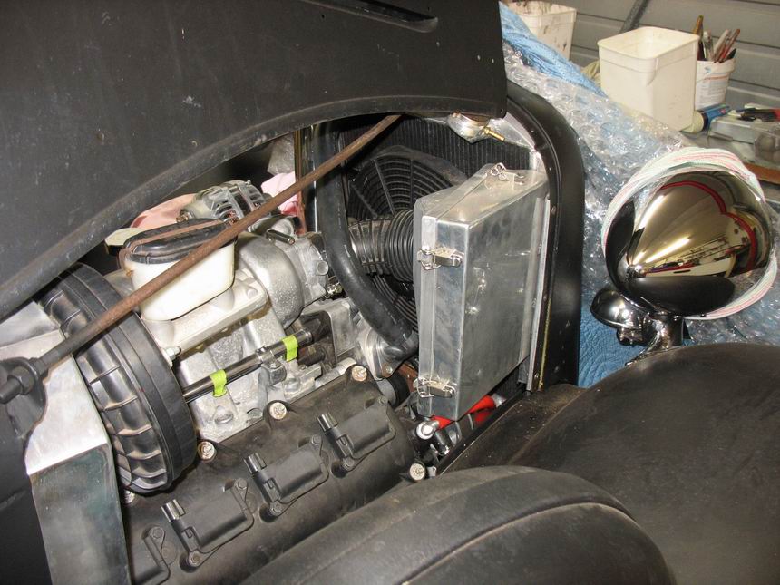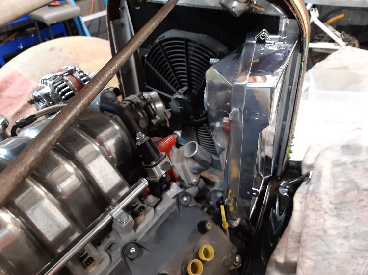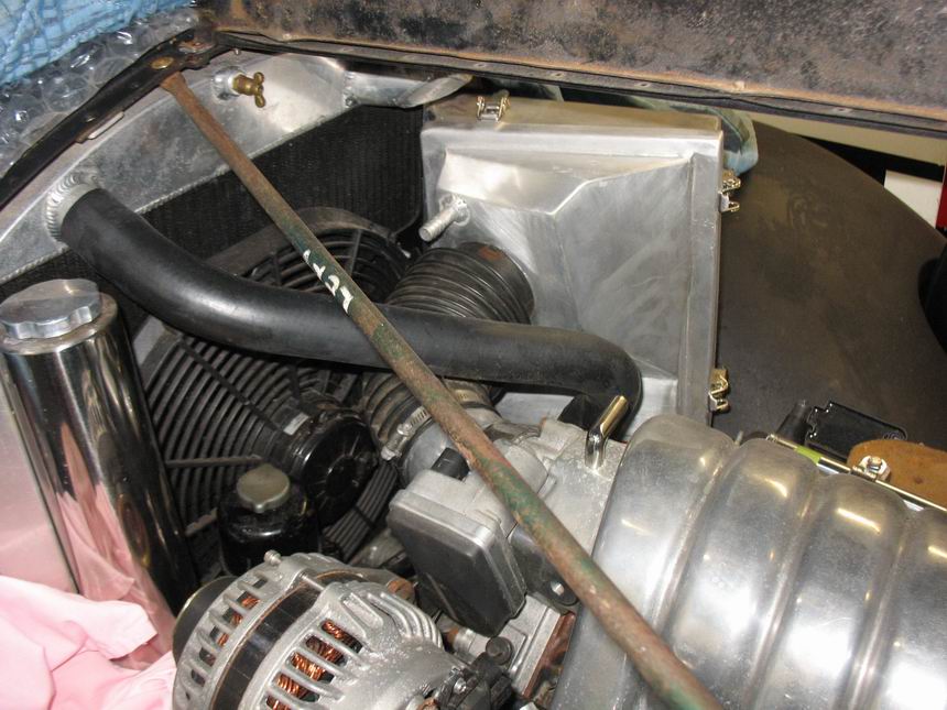 Installed as a trial fit. I made an adaptor for the throttle body to take the Commodore flex pipe. Note how the Commodore radiator hose I found fits perfectly and goes around everything else. |
