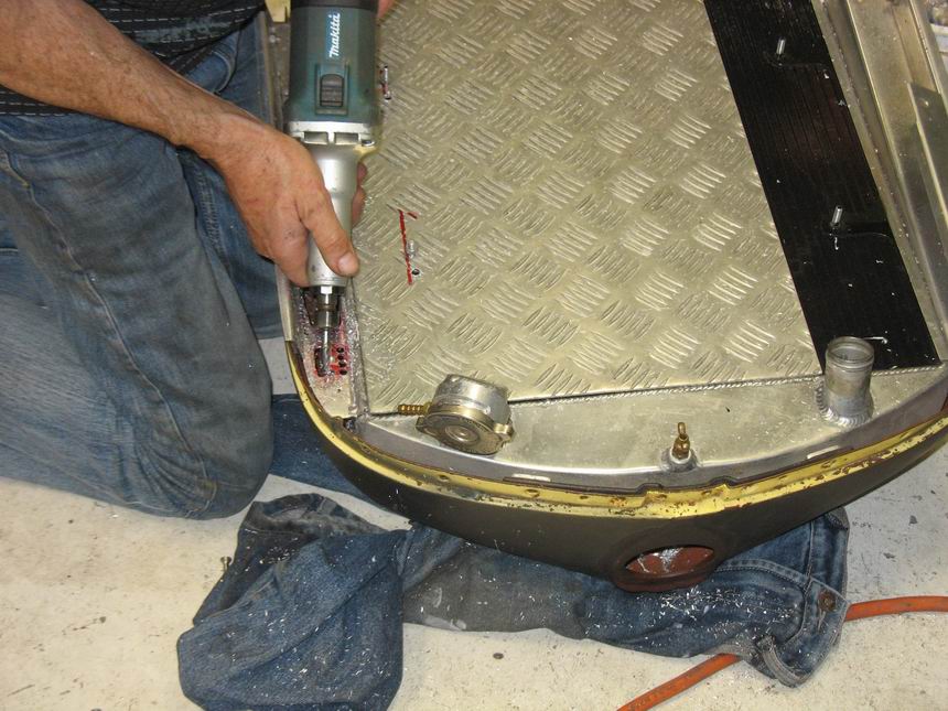 With both halves welded I drilled out holes for the air intake.