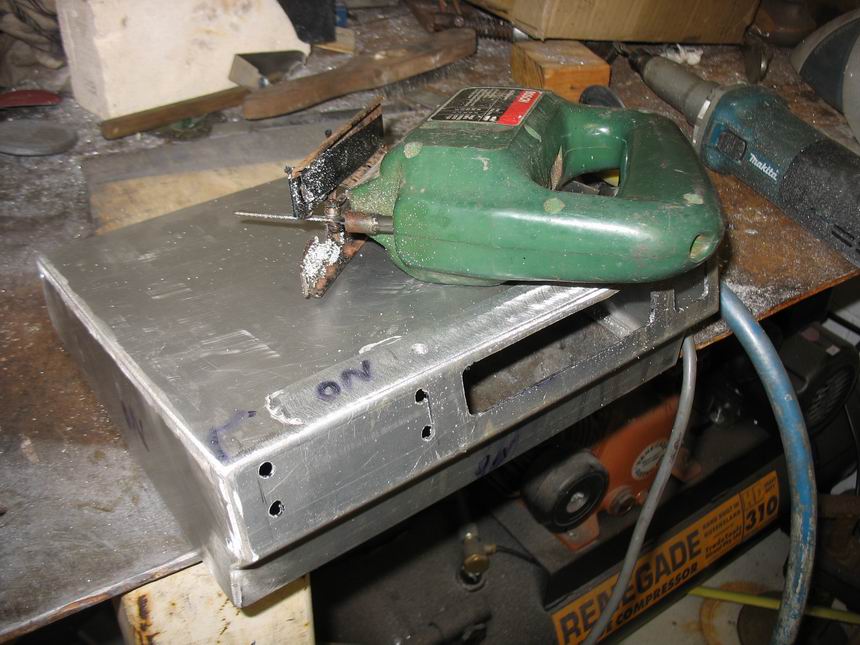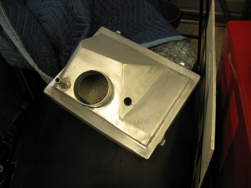 This is the final shape of the engine side of the box. The hose fitting is for the crankcase vent, the hole for the air-temp sensor. |