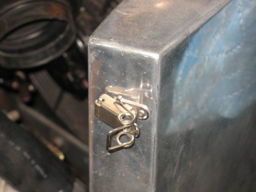I started by cutting some air holes in the side support panels of my Aluminium radiator. The checkerplate is to protect the core. I painted the core black as I live near the ocean and salt kills alloy very quickly. Not sure if it helps with cooling. Radiator was custom built to my drawings, I made the side plates.