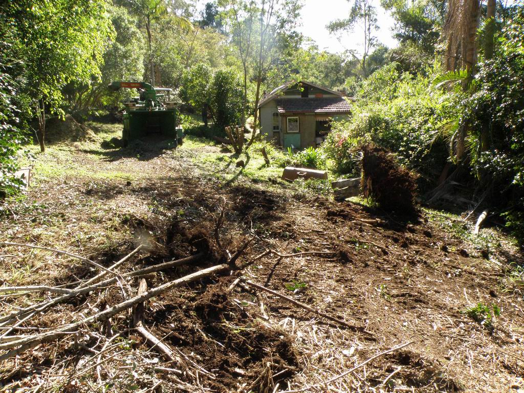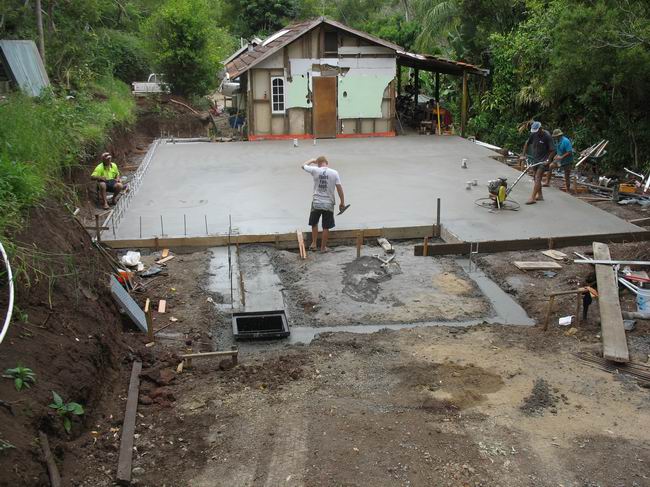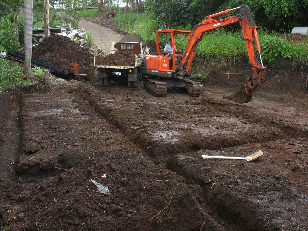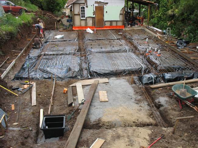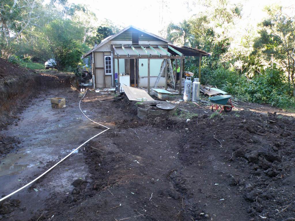 This was the view from up approximately the same position as the inset photo above of the completed house. The old bathroom comes down, you can see the remians of the old septic tank. The new driveway has been constructed and preparation for the slab is underway.