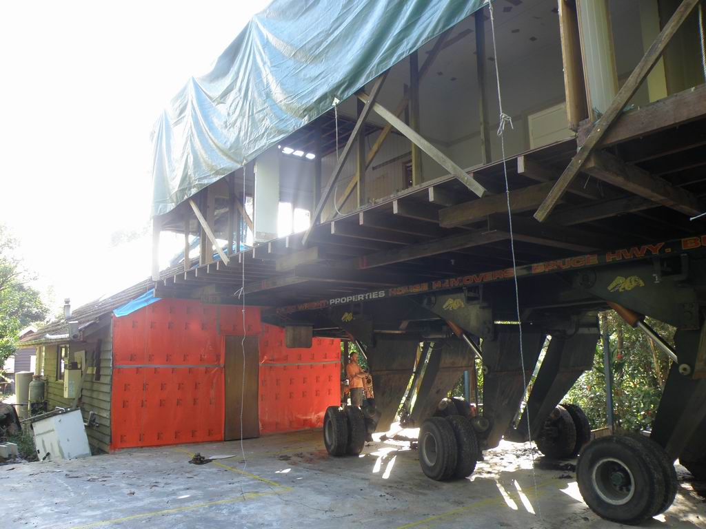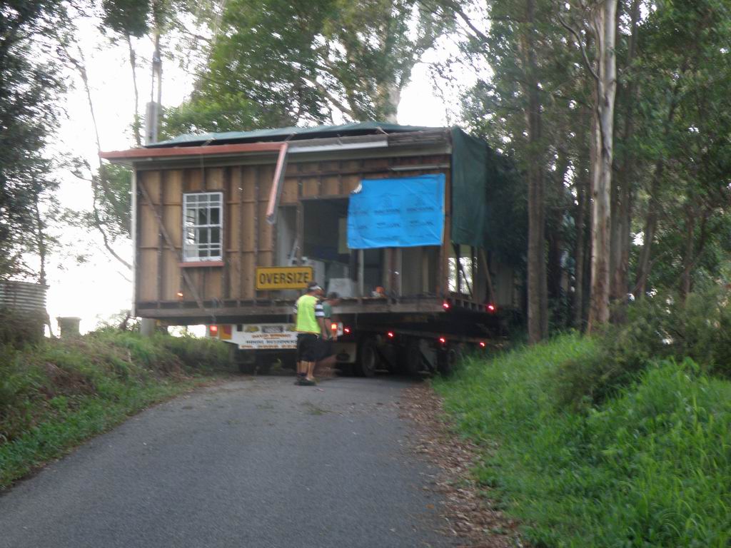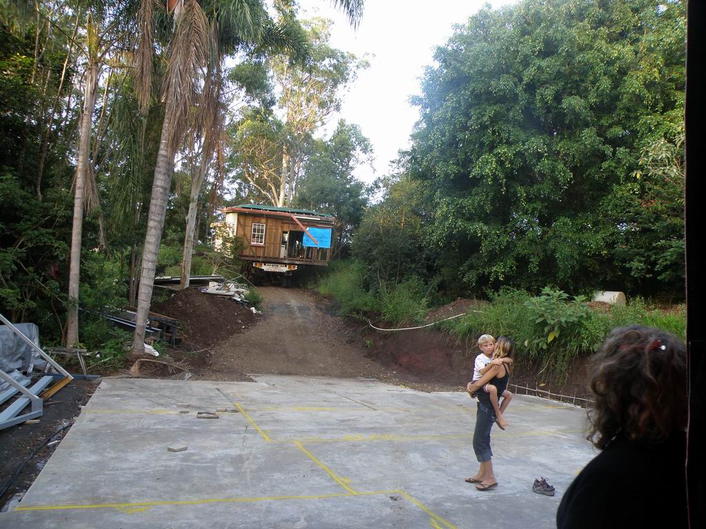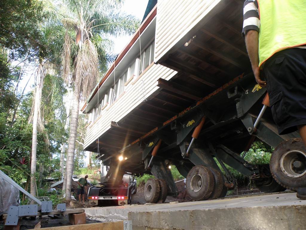 A steep narrow winding road, in reverse, with half a house on board !!!! Just a few trees to work around too. The target, and the steep driveway, and a few more trees to dodge. Remote control on each of the 6 pairs of wheels, each strut can be raised, lowered and steered independently. Getting around the palm trees was tricky.