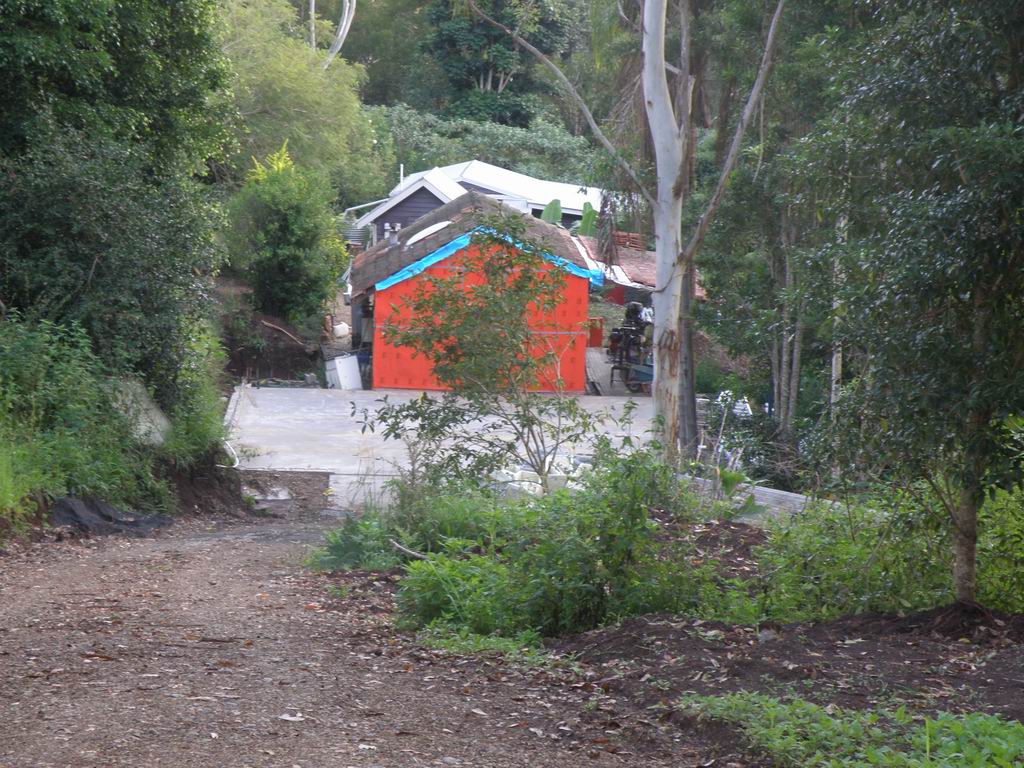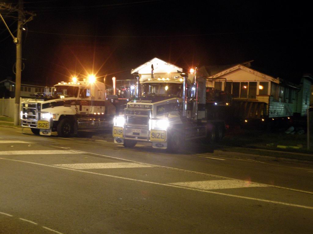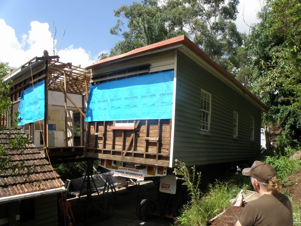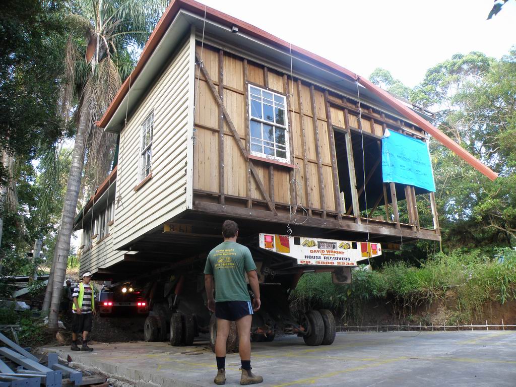 A steep narrow winding road, in reverse, with half a house on board !!!! Just a few trees to work around too. The target, and the steep driveway, and a few more trees to dodge. Remote control on each of the 6 pairs of wheels, each strut can be raised, lowered and steered independently. Getting around the palm trees was tricky.