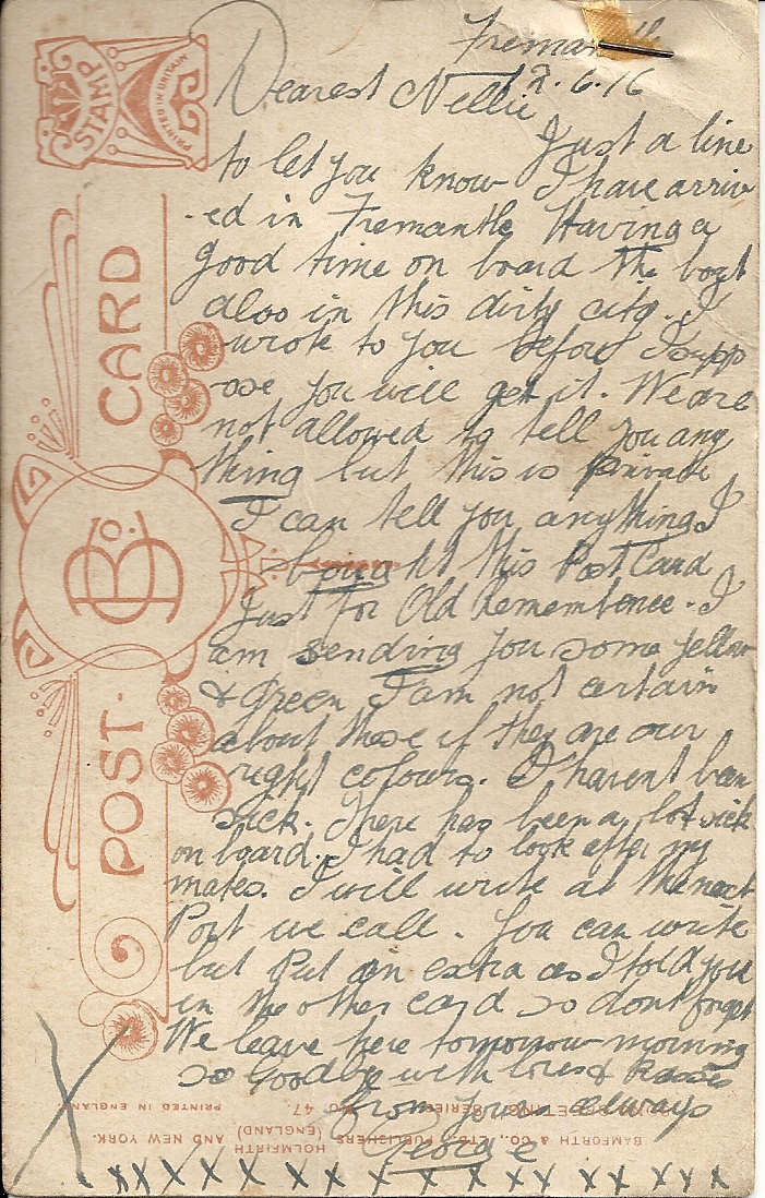 The first card that George sent to Nellie was sent from Freemantle dated 12th June 1916, the day before he sailed to England on the Wandilla (below). He left Melbourne on June 6th 1916. His brother Alf sailed from Melbourne on the HMAT A34 Persic on the 3rd of June 1916.