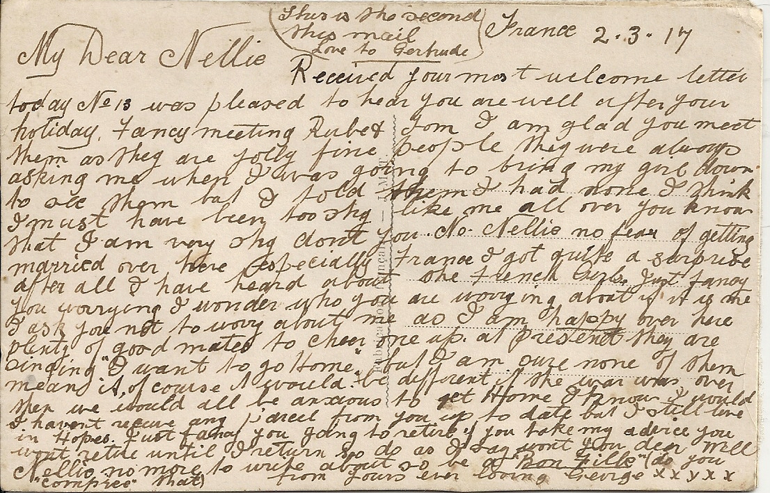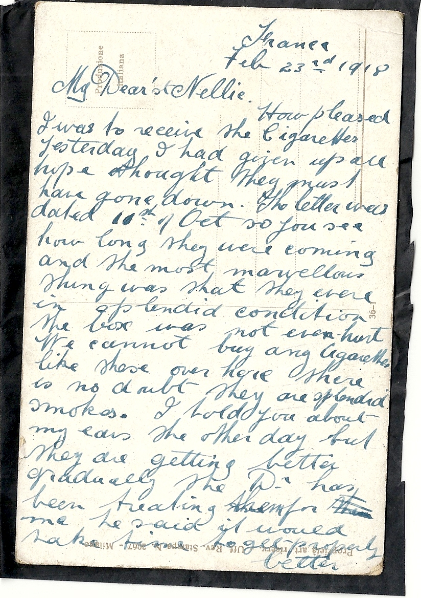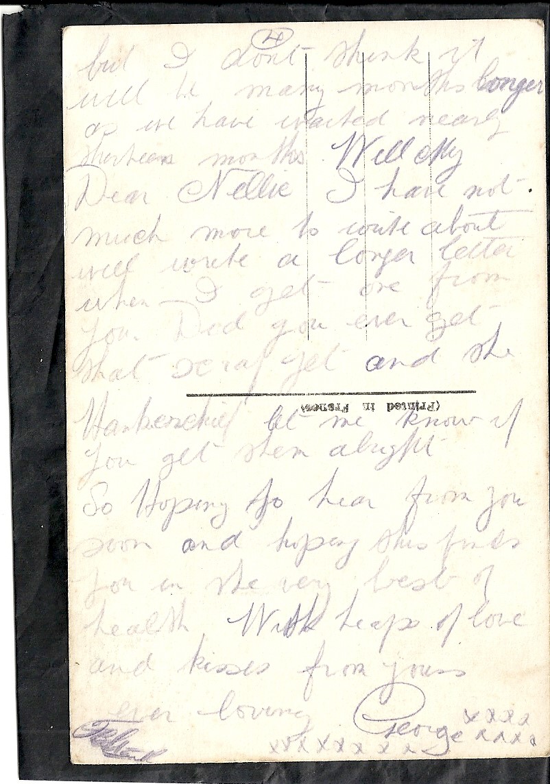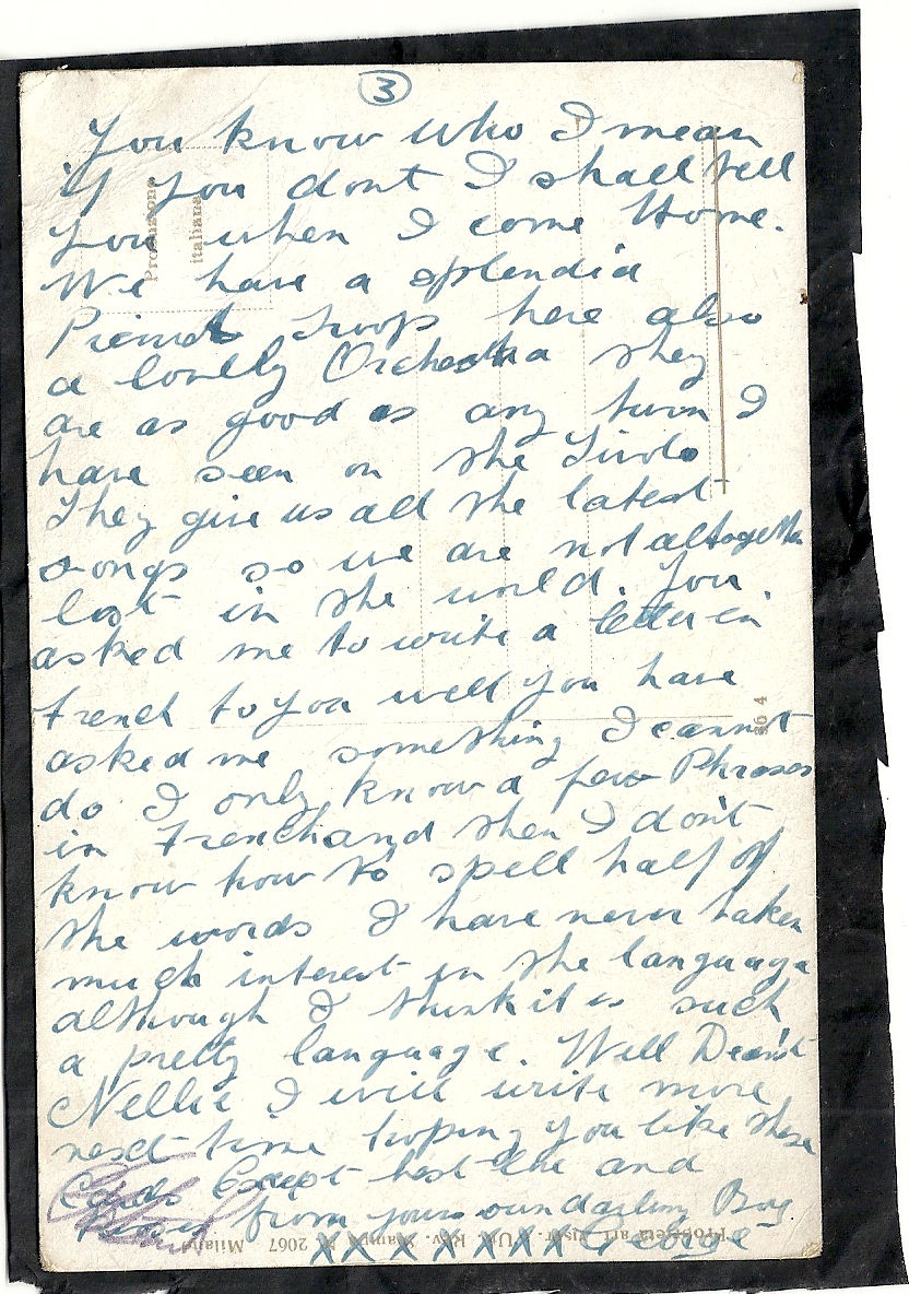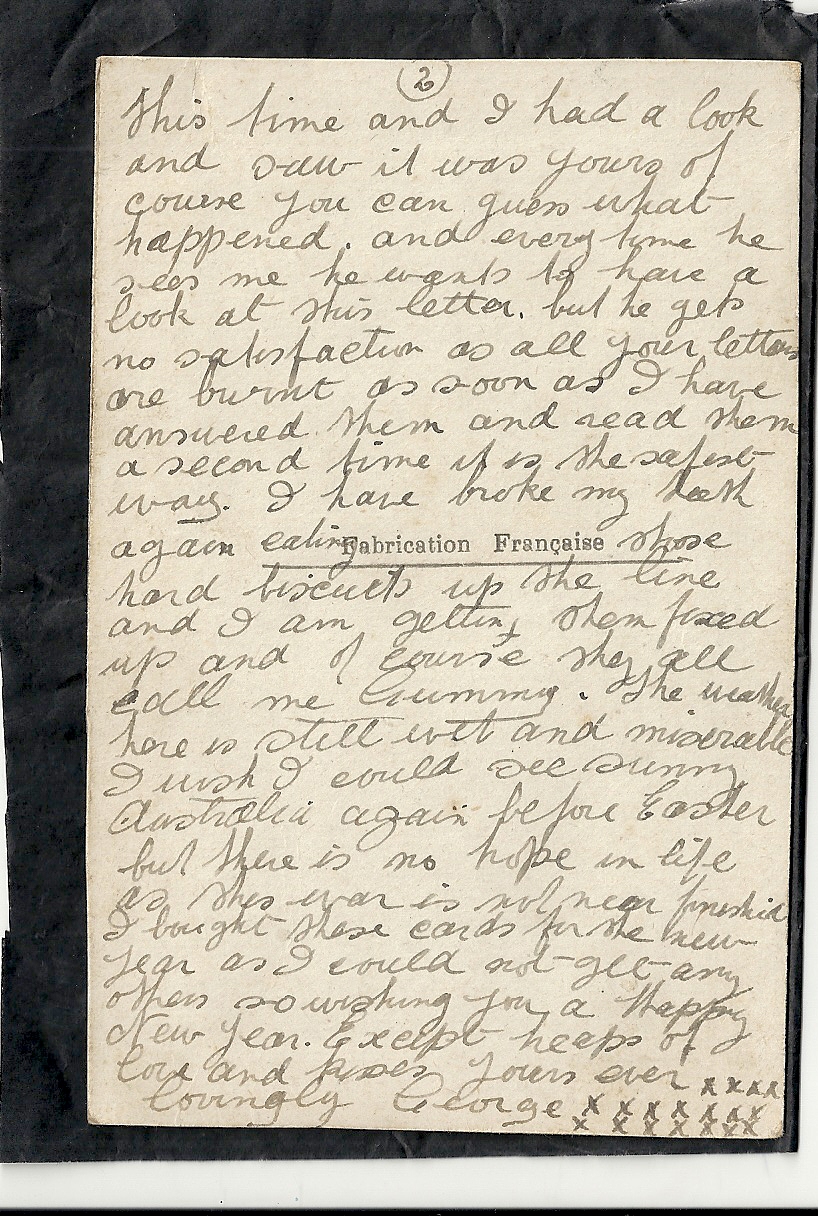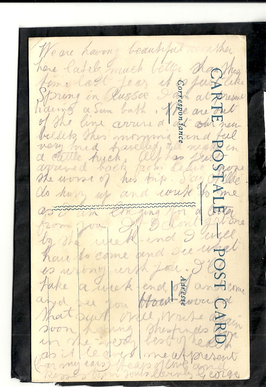 These letters are not full of information about the war as the censors had to read each one. The more interesting ones would have been the ones he received from Nellie but he burnt them after reading twice as he describes here. Nellie also burnt a lot of his letters in the backyard after he died. My mother described finding her out there crying as she threw them into the incinerator. Interestingly she left one for us to find and it is well worth a read. It was from his cousin Sadie in Canada. Link here.