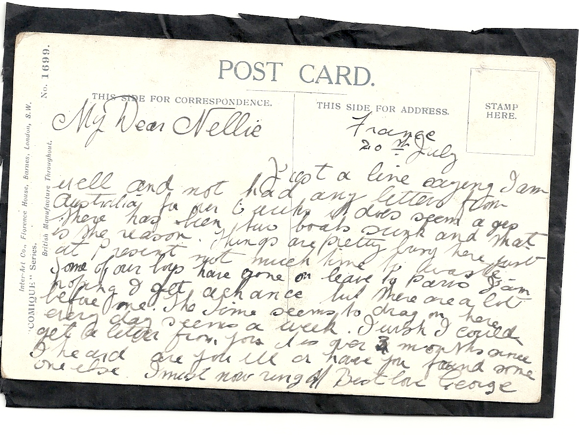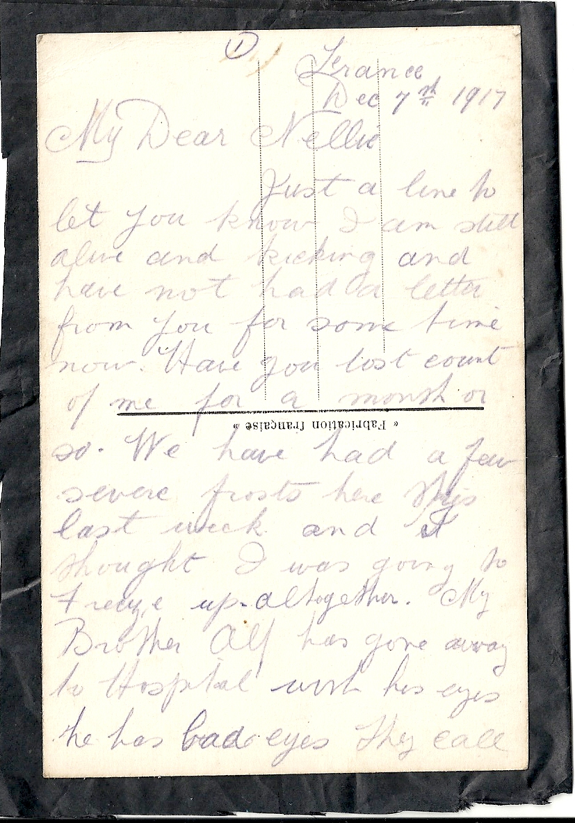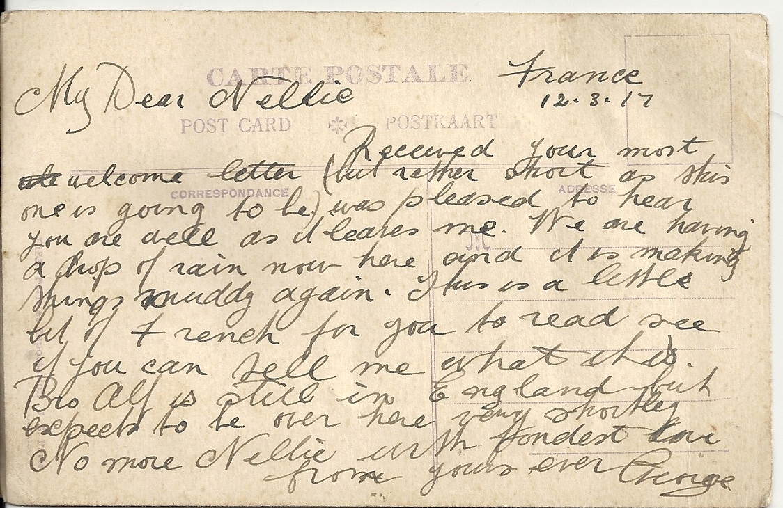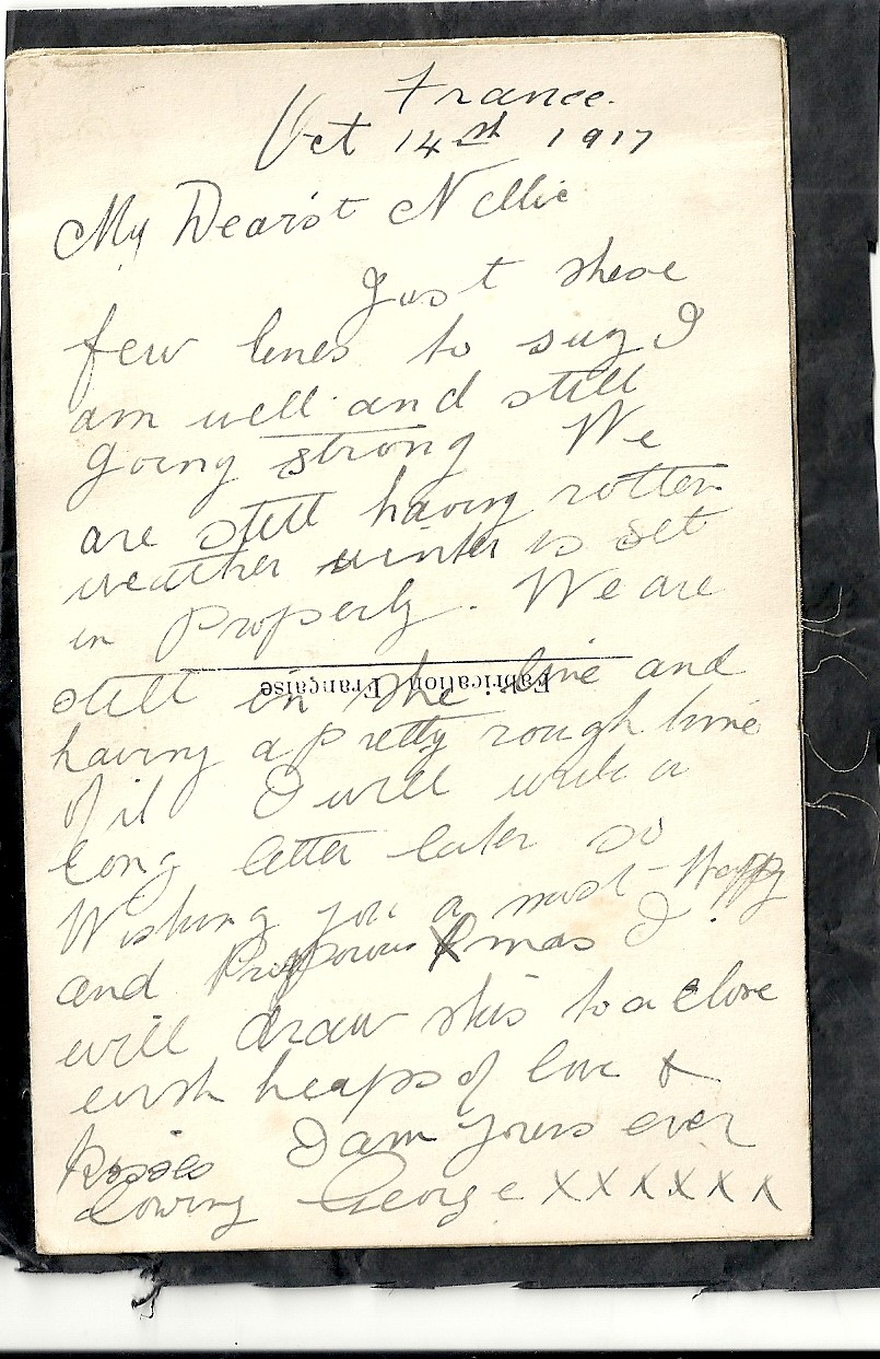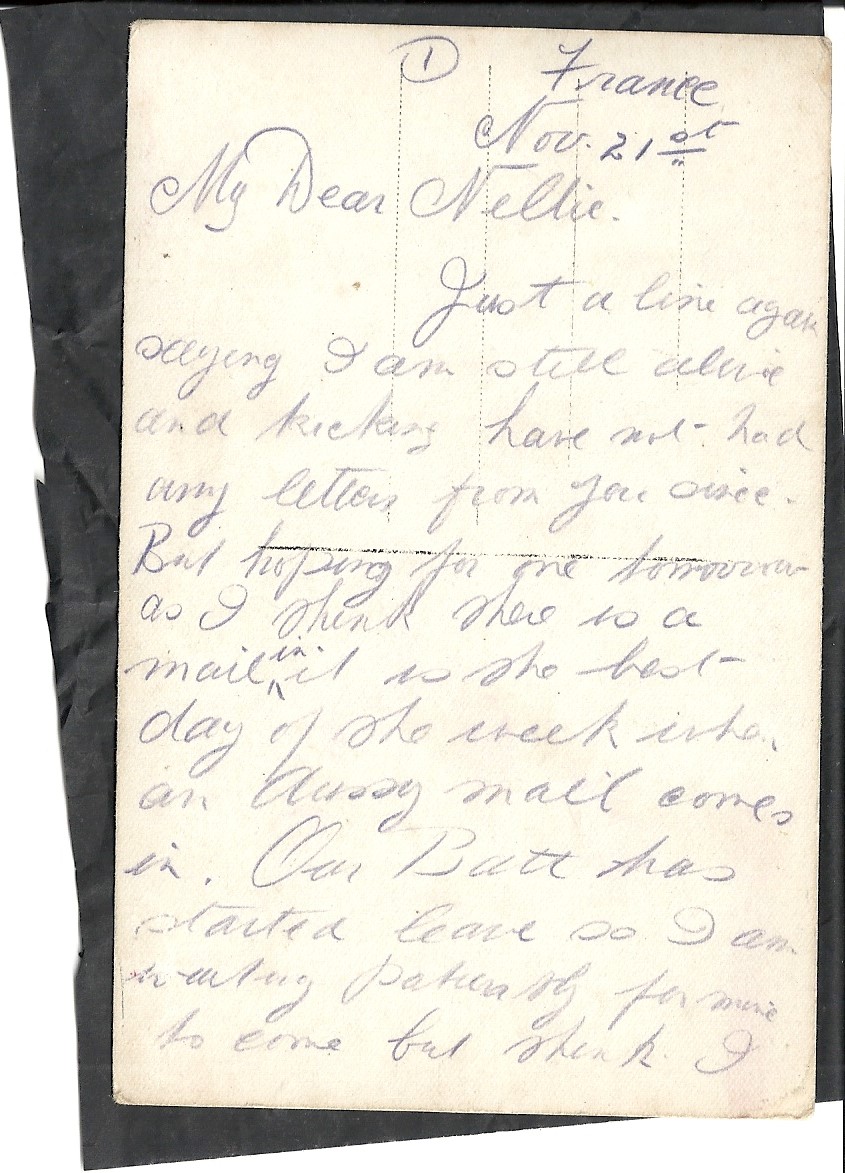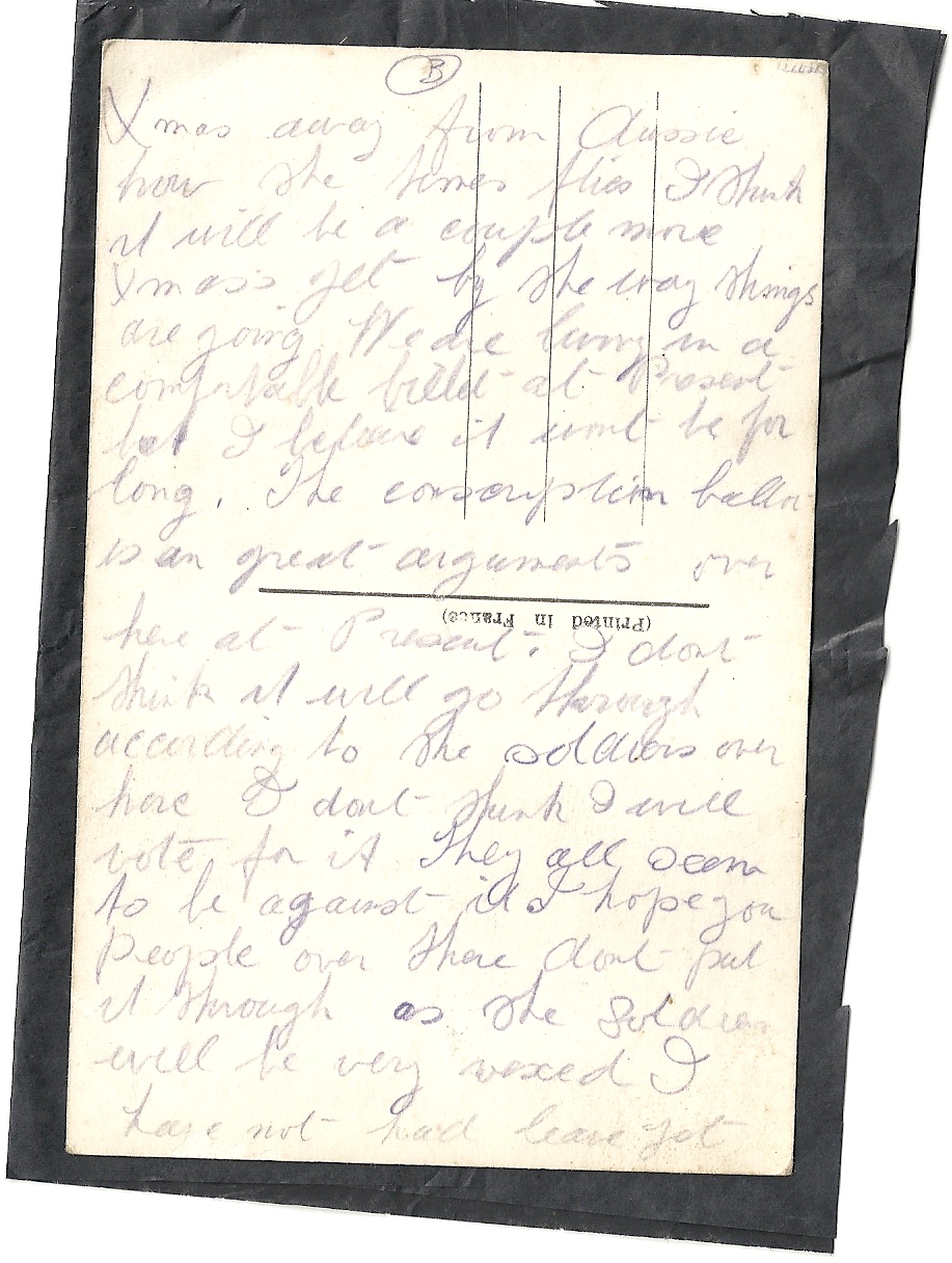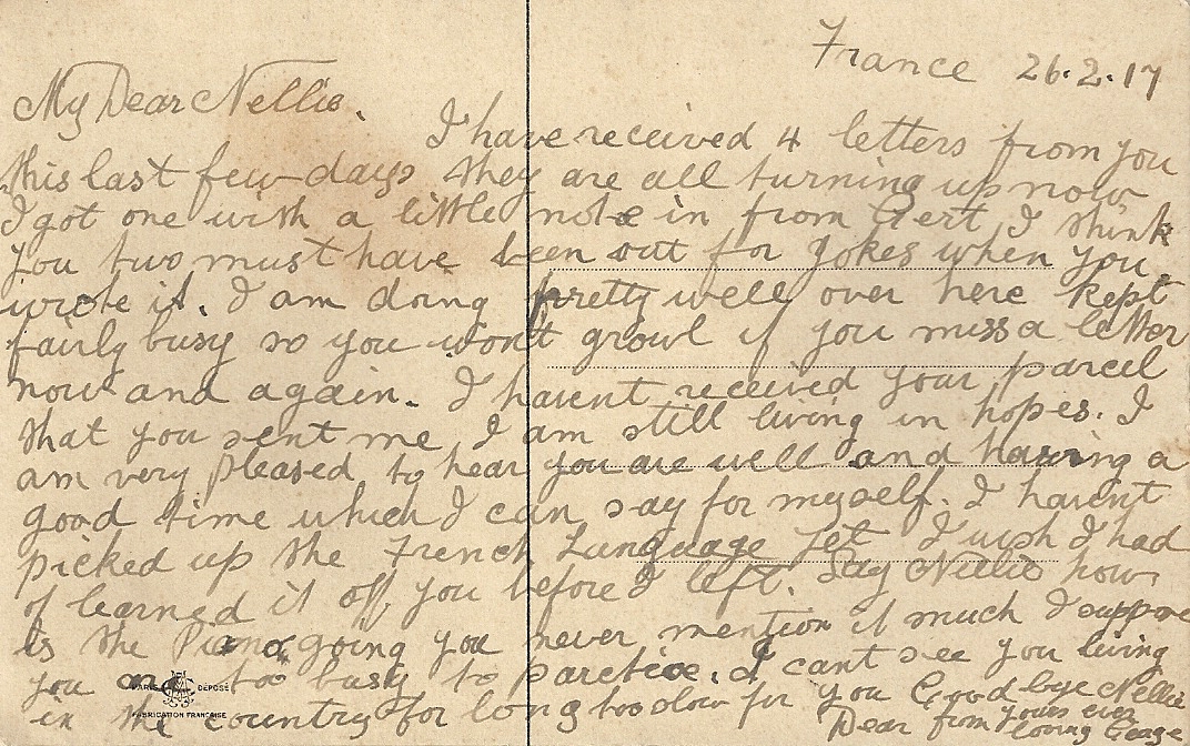 These letters are not full of information about the war as the censors had to read each one. The more interesting ones would have been the ones he received from Nellie but he burnt them after reading twice as he describes here. Nellie also burnt a lot of his letters in the backyard after he died. My mother described finding her out there crying as she threw them into the incinerator. Interestingly she left one for us to find and it is well worth a read. It was from his cousin Sadie in Canada. Link here.