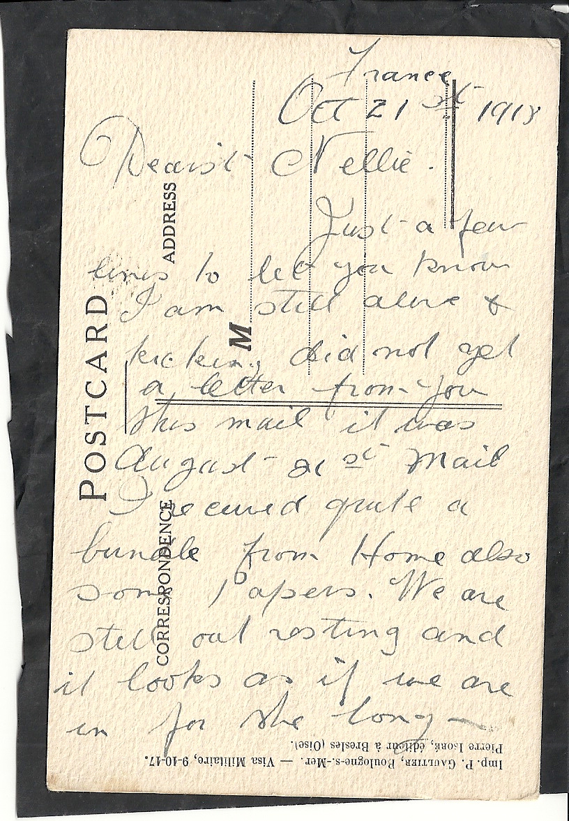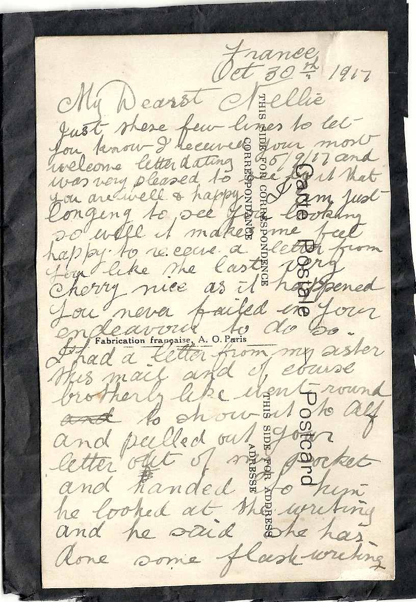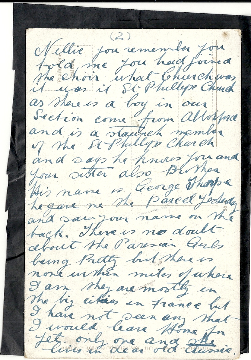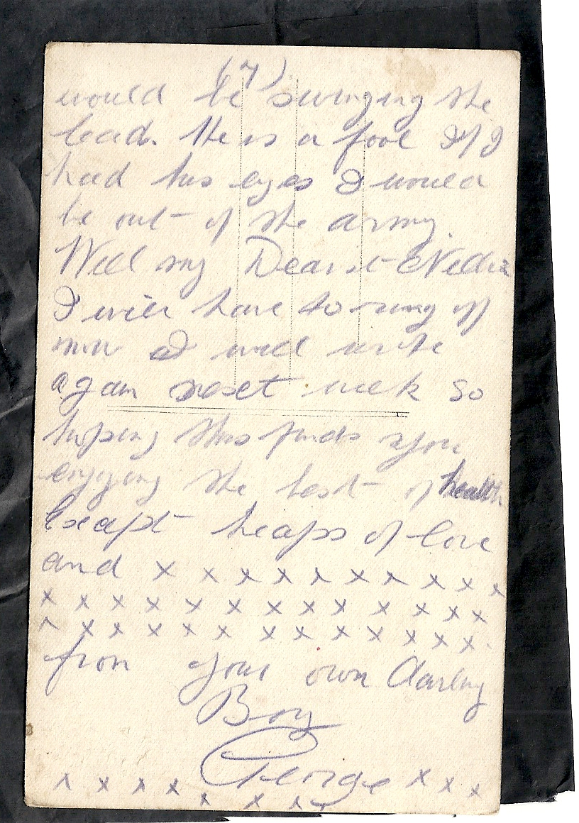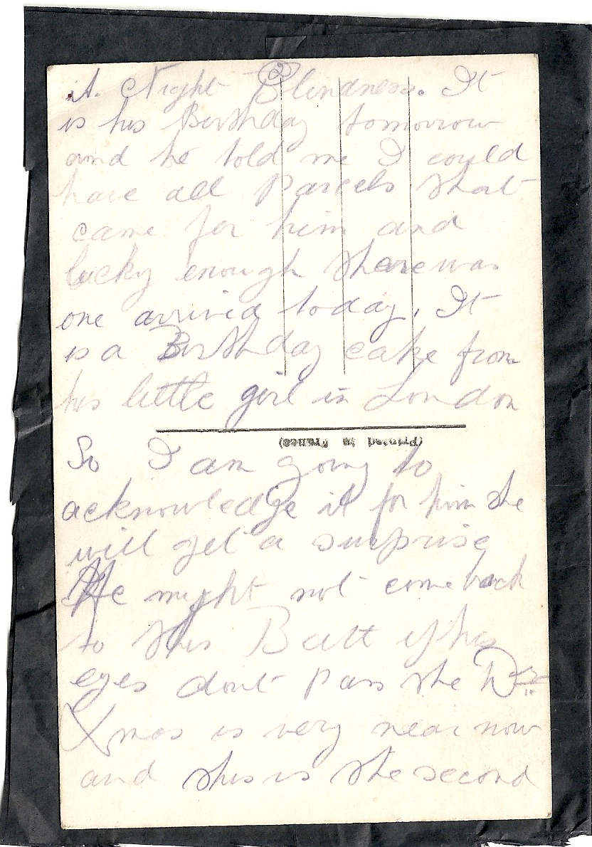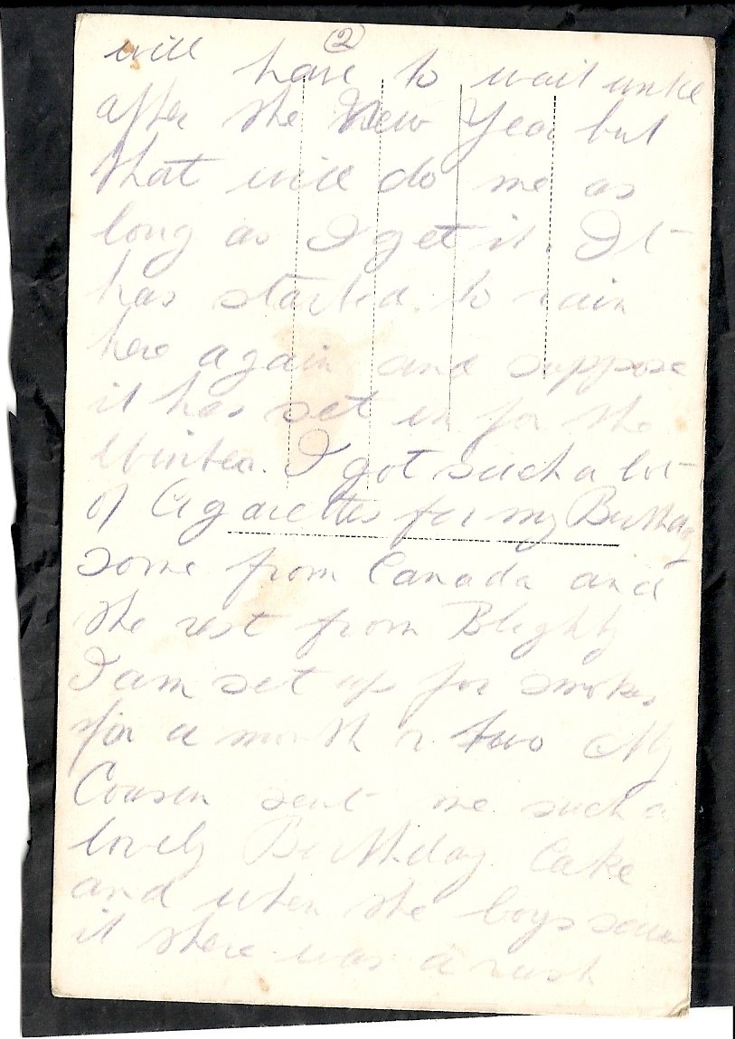 These letters are not full of information about the war as the censors had to read each one. The more interesting ones would have been the ones he received from Nellie but he burnt them after reading twice as he describes here. Nellie also burnt a lot of his letters in the backyard after he died. My mother described finding her out there crying as she threw them into the incinerator. Interestingly she left one for us to find and it is well worth a read. It was from his cousin Sadie in Canada. Link here.