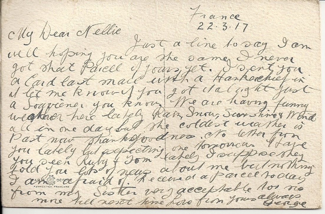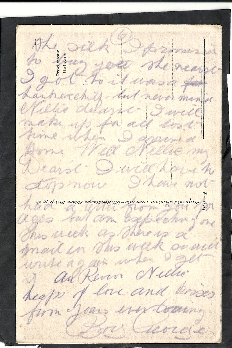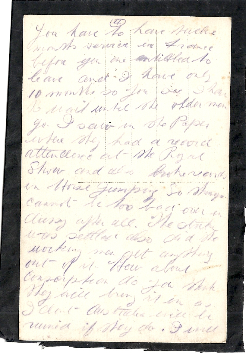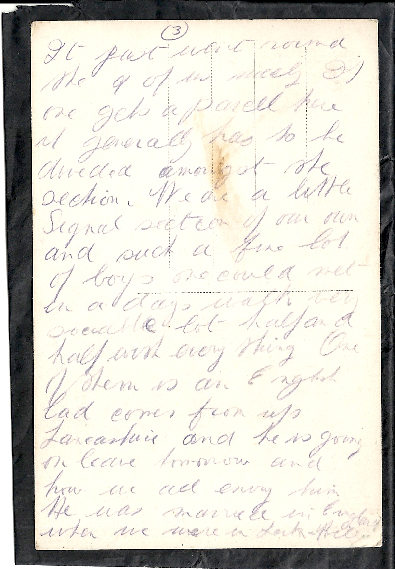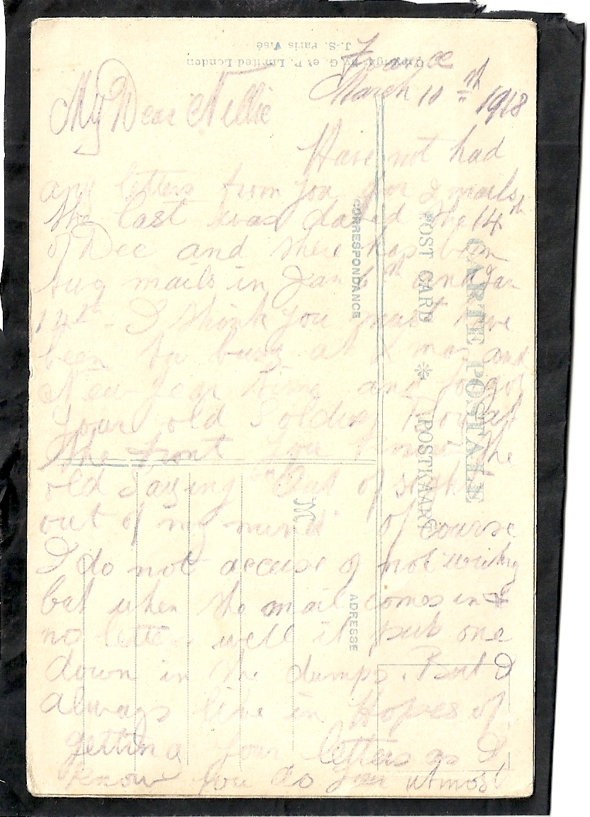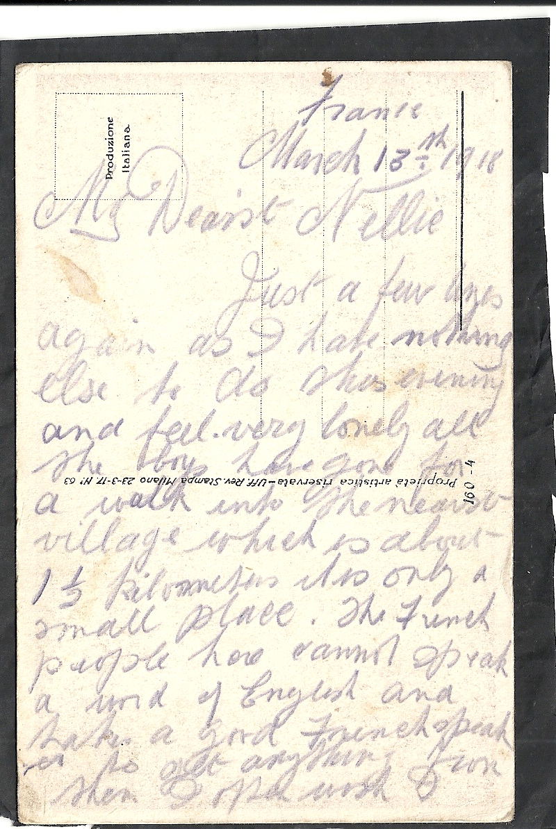 These letters are not full of information about the war as the censors had to read each one. The more interesting ones would have been the ones he received from Nellie but he burnt them after reading twice as he describes here. Nellie also burnt a lot of his letters in the backyard after he died. My mother described finding her out there crying as she threw them into the incinerator. Interestingly she left one for us to find and it is well worth a read. It was from his cousin Sadie in Canada. Link here.