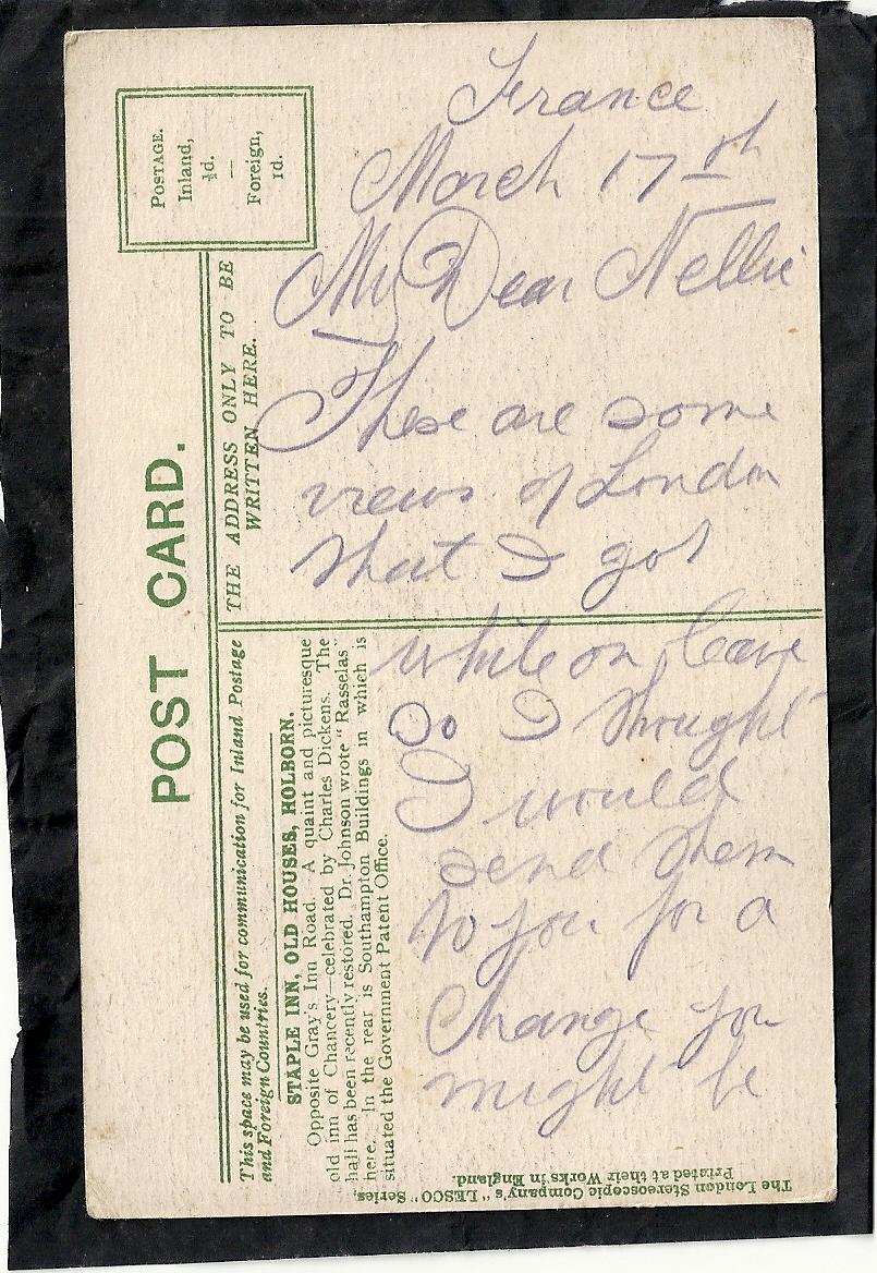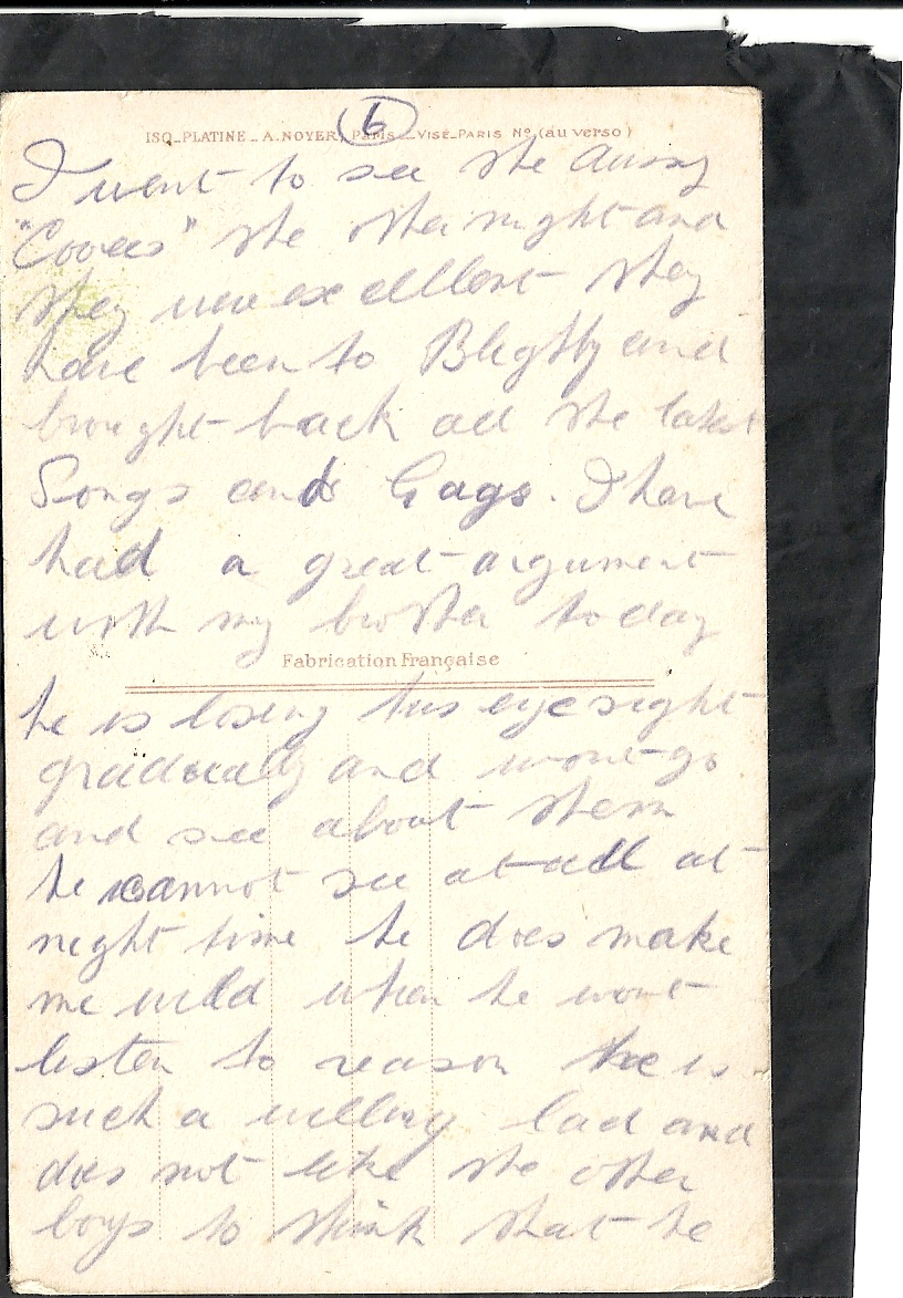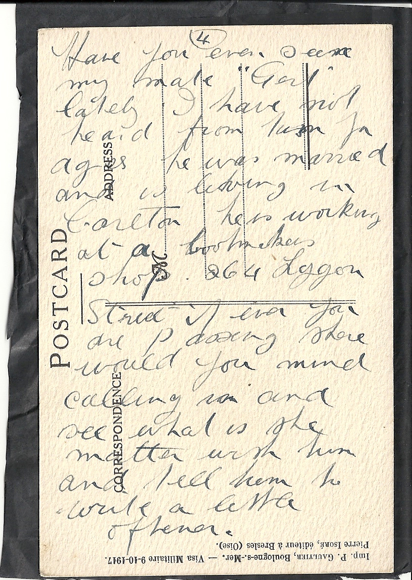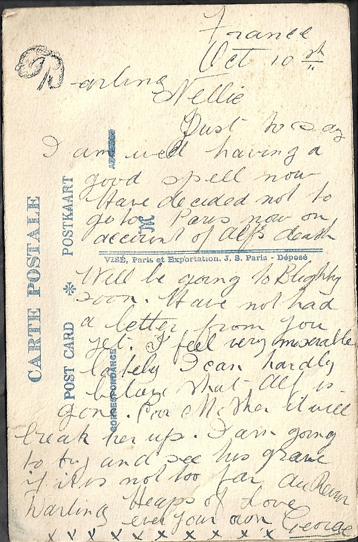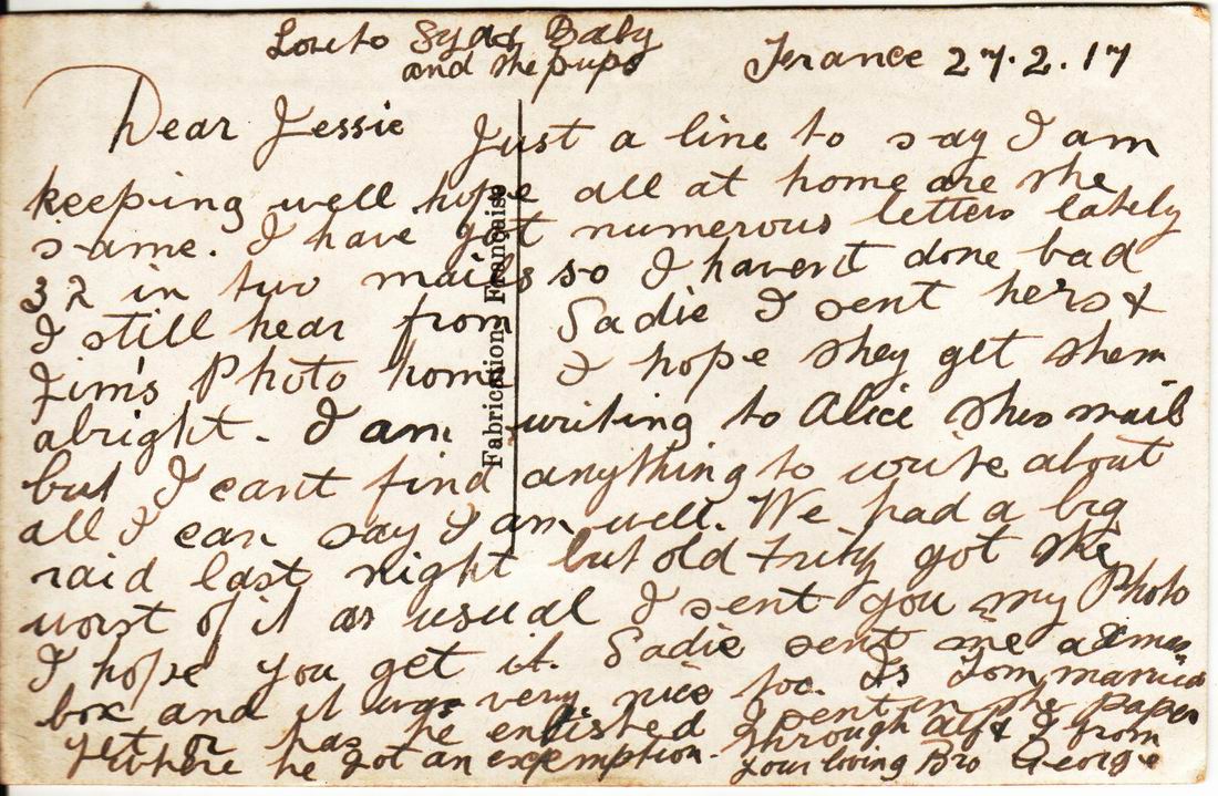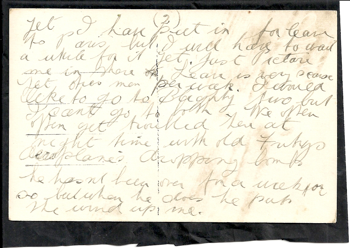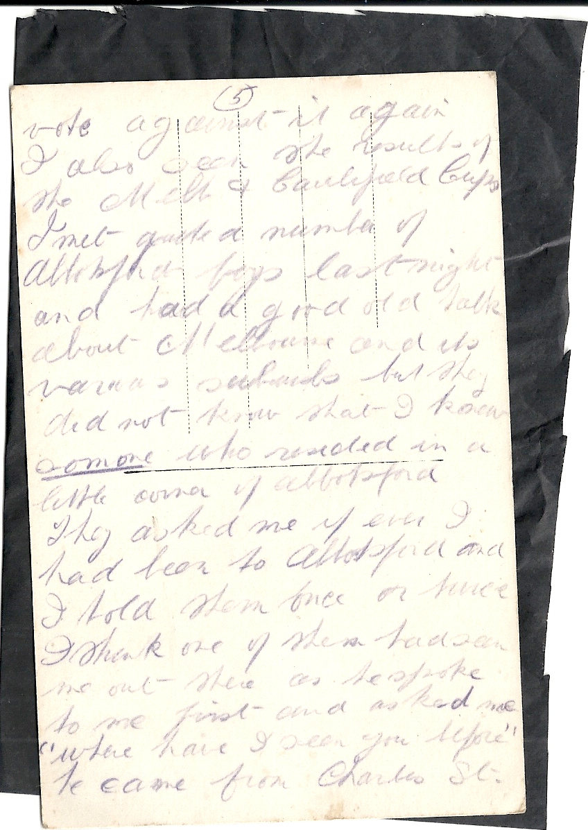 These letters are not full of information about the war as the censors had to read each one. The more interesting ones would have been the ones he received from Nellie but he burnt them after reading twice as he describes here. Nellie also burnt a lot of his letters in the backyard after he died. My mother described finding her out there crying as she threw them into the incinerator. Interestingly she left one for us to find and it is well worth a read. It was from his cousin Sadie in Canada. Link here.